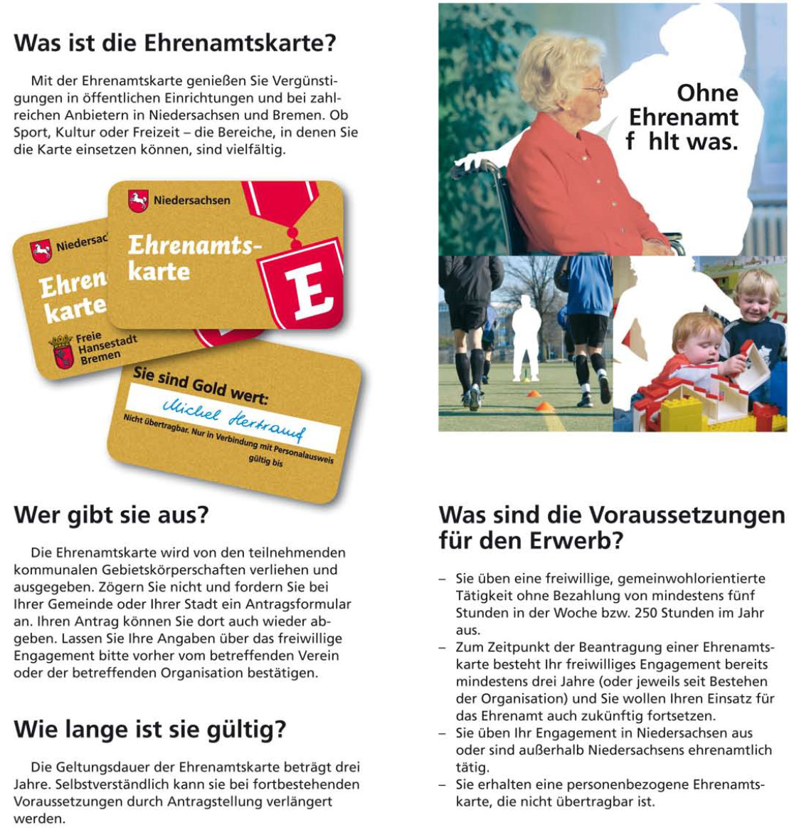 aktuelles-2022-05-ehrenamtskarteIn Niedersachsen sind 3,2 Millionen Menschen freiwillig für das Gemeinwohl tätig. Sie leisten damit einen wichtigen Beitrag für den Zusammenhalt in unserer Gesellschaft und tragen zu einem lebenswerten Niedersachsen bei.